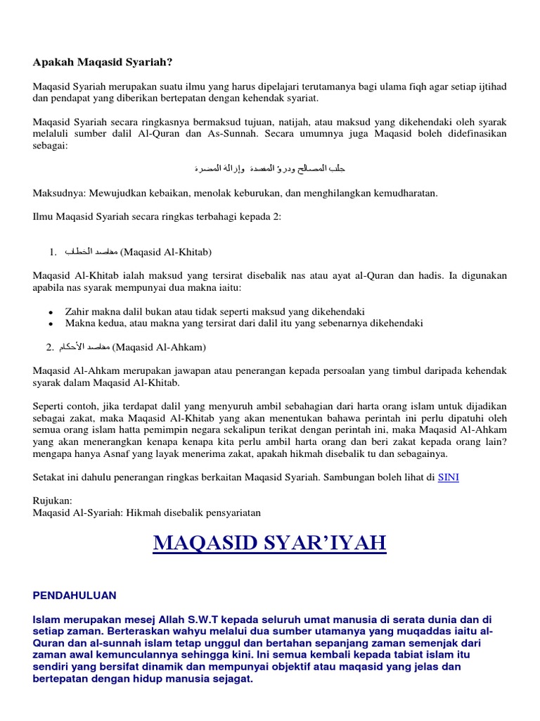 Jika seseorang mengerjakan apa yang. الشريعة secara bahasa artinya jalan yang dilewati untuk menuju sumber air. Tujuan yang ingin dicapai oleh syariat ini untuk merealisasikan kemaslahatan hamba. Maqashid syariah menjadi hal yang semakin relevan dalam menyelesaikan permasalahan di zaman ini. Oleh itu, maqasid syariah mempunyai kekuatan yang sama dengan nas wahyu.